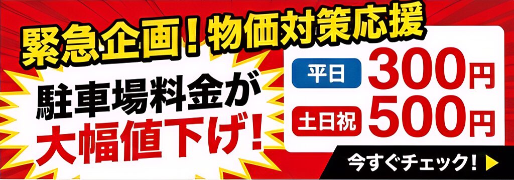 家計応援!お得な割引で賢く駐車! 物価高騰が続く今、お車でのお出かけも大変ですよね。そこで、当駐車場では皆様の家計を応援するため、特別割引キャンペーンを実施いたします! 料金案内 平日: 300円/回 (一度駐車場を出られると再度料金がかかります... -